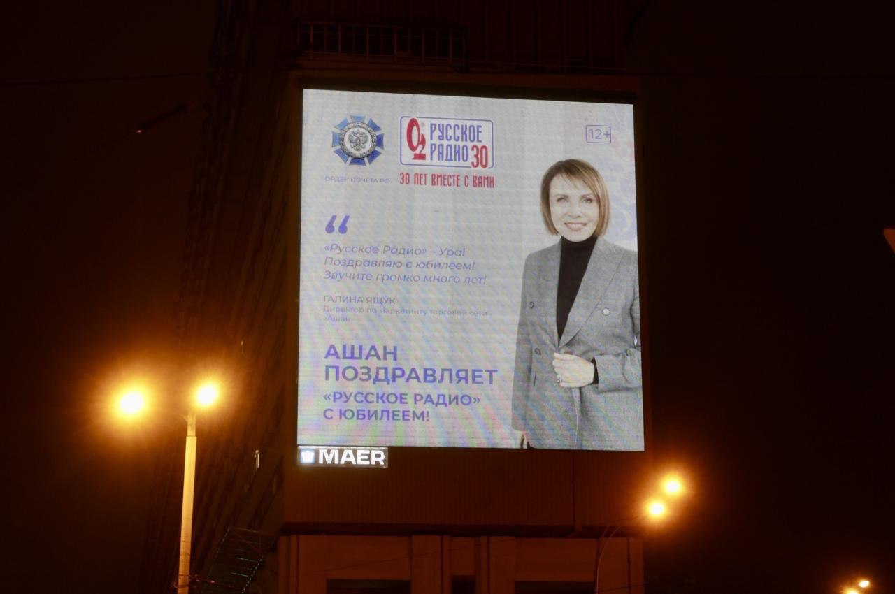 На цифровых фасадах Москвы и Московской области «Русское Радио» поздравляют топ-менеджеры крупных компаний: Т-Банк, «Лента», «Ашан», «Мегафон», Queisser Pharma, банк ПСБ.