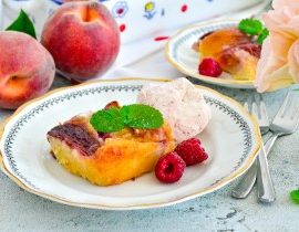 Персиковый коблер — это восхитительное десертное блюдо, особенно популярное в летний период, когда персики свежи и сочны. Вот простой рецепт: Ингредиенты: Для начинки: Для теста: Инструкции: Этот персиковый коблер приятно сочетает влажное тесто с сочными персиками, создавая восхитительный десерт. Приятного аппетита!