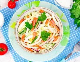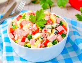 Вот рецепт вкусного салата с крабовыми палочками и колбасой: Ингредиенты: Инструкции: Этот салат получается легким и освежающим, отлично подходит для летних вечеринок или как закуска к обеду. Приятного аппетита!