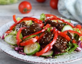 Вот рецепт вкусного салата с жареной говядиной, кунжутом и перцем: Ингредиенты: Инструкции: