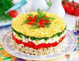 Вот простой и вкусный рецепт салата с куриной грудкой, яйцами и сыром: Ингредиенты: Для заправки: Инструкции: