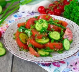 Вот простой рецепт салата из огурцов и помидоров с зеленью: Ингредиенты: Инструкции: Этот салат прост в приготовлении, освежающ и идеально подходит для летнего времени.