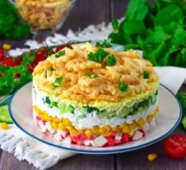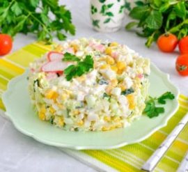 Вот простой рецепт салата с крабовыми палочками, крабовыми чипсами и кукурузой: Ингредиенты: Для заправки: Инструкции: Этот салат получается легким, освежающим и полным вкуса. Он отлично подходит как легкое блюдо на обед или ужин.