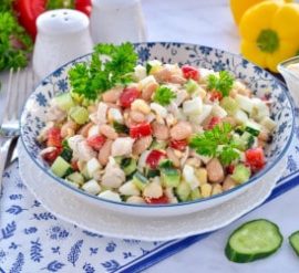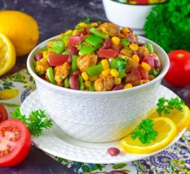 Салат с курицей, фасолью и кукурузой — это здоровый и питательный выбор для обеда или ужина. Вот рецепт для такого салата: Ингредиенты: Инструкции: 2. В небольшой миске приготовьте заправку, смешав оливковое масло, сок лимона и измельченный чеснок. Посолите и поперчите по вкусу. 3. Полейте салат с курцем, фасолью и кукурузой приготовленной заправкой и хорошо перемешайте,