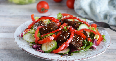Вот рецепт вкусного салата с жареной говядиной, кунжутом и перцем: