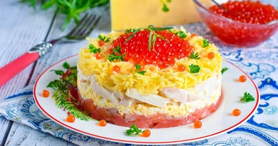 Этот салат отличается богатым вкусом и ароматом благодаря красной икре, семге и кальмарам. Попробуйте и наслаждайтесь!
