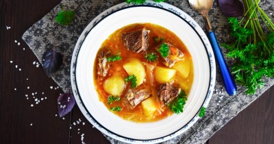 - Доведите суп до кипения, затем уменьшите огонь, накройте кастрюлю крышкой и варите на медленном огне до тех пор, пока мясо и овощи не станут мягкими.